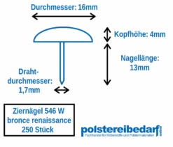 Der Kopfdurchmesser, der gewölbten Ziernägel beträgt 11 mm.