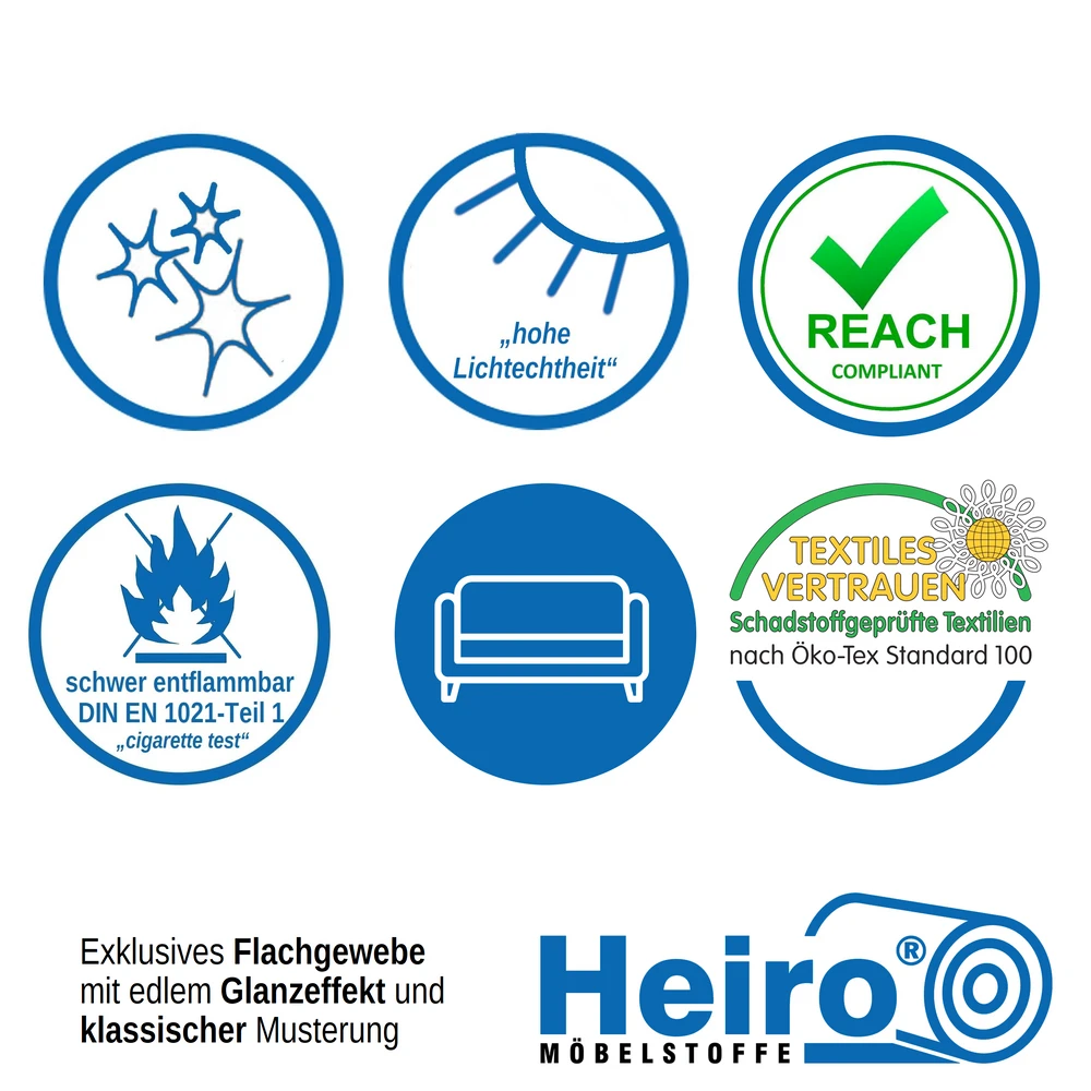 Modernes exclusives Flachgewebe mit edlem Effektglanz in sehr hoher Qualität. Durch die dezente Farbkombination, dem zarten Glanz und der klassischen Musterung wirkt dieser Stoff besonders elegant. Er ist sehr strapazierfähig und für sämtliche Polsterarbeiten und für die Dekoration verwendbar. Einsetzbar in lichtdurchfluteten Gebäuden aufgrund der hohen Lichtechtheit.