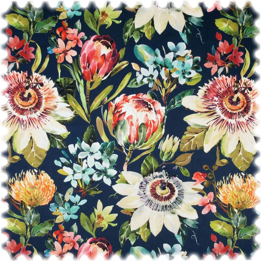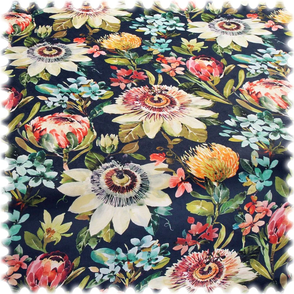 Dieser hochwertige Samt Möbelstoff überzeugt durch sein tropisches Blumendesign auf dunkelblauem Hintergrund für eine mysteriöse Dschungel-Atmosphäre. Betreten Sie das paradiesische Land des Regenwaldes, denn Paradise bringt einen Hauch von Exotik in Ihre Inneneinrichtung für ein luxuriös frisches, zeitgemäßes Ambiente. Der Samtstoff besitzt eine sehr flauschig weiche Haptik und ist mit 50.000 Scheuertouren zudem noch sehr robust und langlebig. Der Polsterstoff ist in allen Bereichen einsetzbar z.B. für Polstermöbel, Sofas, Stühle, Sessel, Vorhänge, Jalousien, Tischdecken, Tagesdecken, Kissen und vieles mehr.