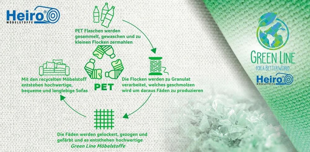 Das was sonst unsere Natur und Ozeane verschmutzt hätte, wird im nächsten Moment zu einem modernen Microfaser Möbelstoff, mit dem gewissen umweltfreundlichen Extra. Die Heiro Green Line Möbelstoffe werden aus recycelten PET Flaschen hergestellt und benötigen bei ihrer Produktion nur ein Bruchteil der Energie, die normalerweise für die Produktion eines Möbelstoffes benötigt wird.
