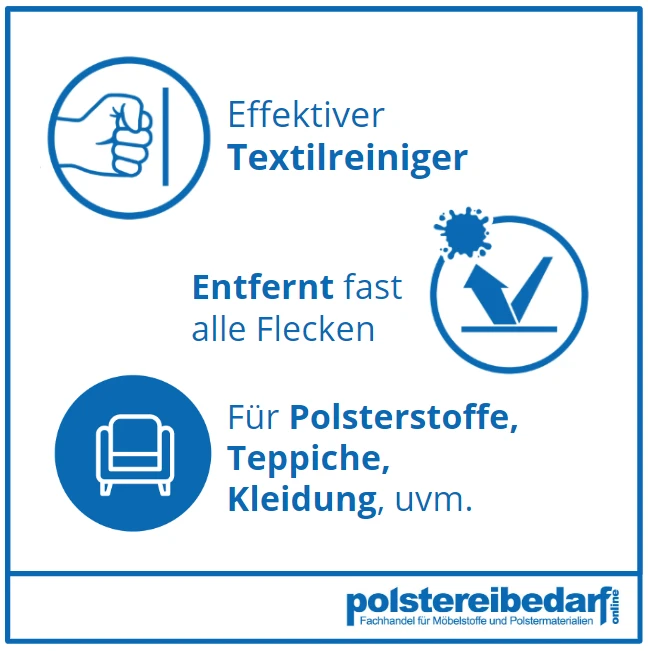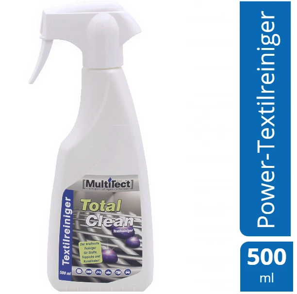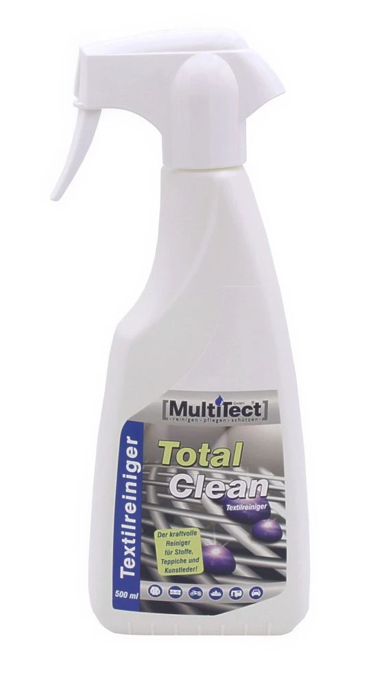 Dieser mit Textilweichmacher hergestellte Reiniger entfernt effektiv die am häufigsten vorkommenden Flecken, wie z.B Rotwein, Kaffee, Schokolade, Obst, Blut, Öl, Kuli aus Polsterstoffen, aber auch aus Teppichen, Kleidungen, Kunstleder und vielen anderen Textilien. Multitect Total Clean wirkt zudem antistatisch.