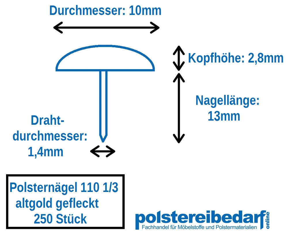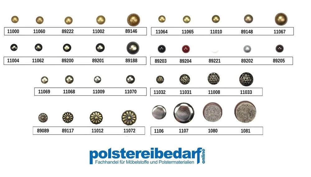 Polsternägel haben eine lange Tradition beim Polstern. Es gibt sie in vielen Farben, Größen und mit ganz unterschiedlich geformten Köpfen. Ziernägel können dicht an dicht angebracht werden oder in einem bestimmten Abstand. Auch über Gimpen, Bändern oder Borten sehen sie interessant aus.