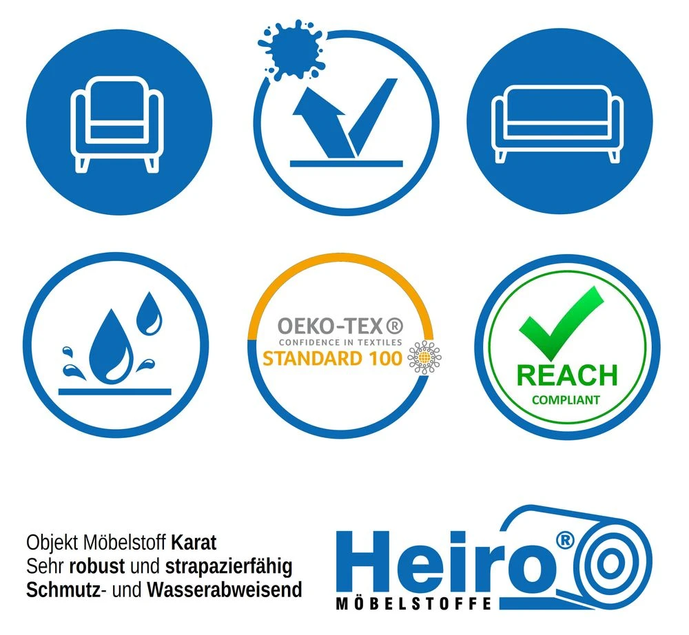 Der Objekt Möbelstoff Karat ist ein schwerer und hochstrapazierbarer Flachgewebe Polsterstoff mit einem TOP Preis-Leistungsverhältnis. Dieser Bezugsstoff wird aufgrund seiner hervorragenden Produktwerte häufig für den Dauereinsatz auf Büromöbeln verwendet, er ist aber natürlich auch im Privatbereich zu empfehlen. Seine Struktur hat die Optik eines Leinenstoffes ist aber durch sein stabiles Polyestergewebe sehr robust. Zusätzlich ist Karat noch mit einem Wasser- und schmutzabweisenden Fleckschutz ausgerüstet.