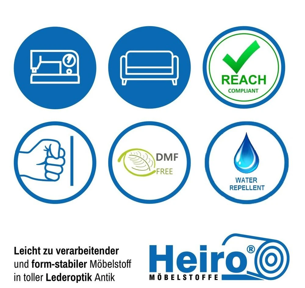 Rom Antik aus 100% Lederfasern in der Grundschicht. Dieses innovative Produkt hat fast alle Eigenschaften von Leder (Geruch, Aussehen und Anfassgefühl), jedoch einen geringeren Preis als echtes Leder. Die lederähnlichen Eigenschaften des Materials, der günstige Preis und die Verarbeitung als Bahnmaterial machen Rom Antik interessant. Durch seine naturgetreue Haptik ist das Material kaum von Echtleder zu unterscheiden. Sehr stabile, feste und schwere Ausführung mit einem Flächengewicht von ca. 927 g / lfm.