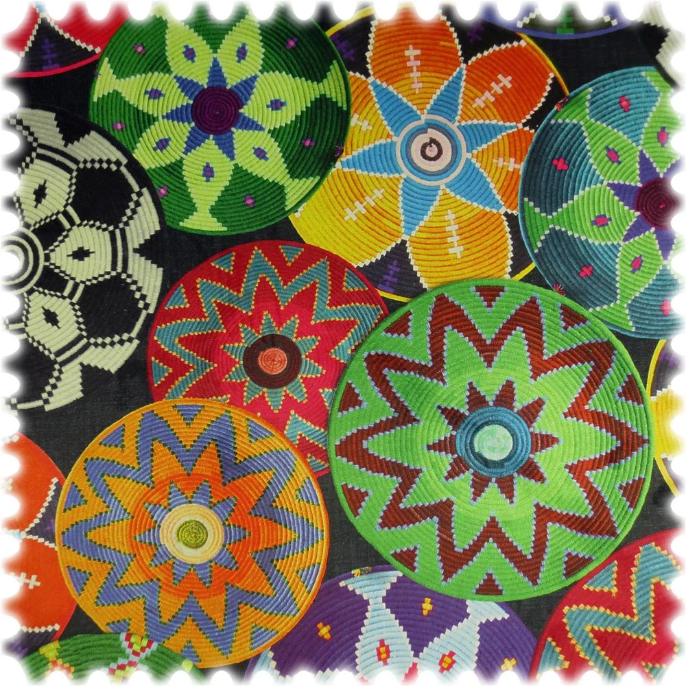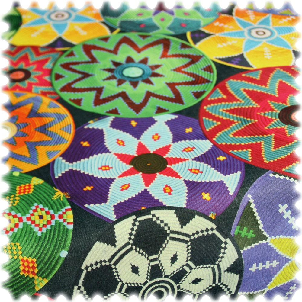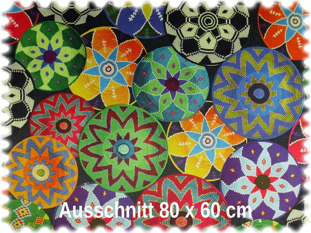 Exklusiv in einem aufwendigen Verfahren bedruckter Möbelstoff, mit bunten Motiven in Kreisform. Dieser Samtstoff ist sehr strapazierfähig und weißt eine Scheuerbeständigkeit von 70.000 Touren auf. Zusätzlich ist er mit einem Fleckschutz ausgerüstet und dem entsprechend schmutz- und wasserabweisend. Der samtweiche exotische Stoff eignet sich mit diesem besonderen Motiv bestens für den Bezug von Polstermöbeln, Türpolsterungen, Vorhänge, Tagesdecken, Tischdecken, Wandbespannungen oder Kissenbezüge. Auch die Einarbeitung in Taschen oder andere Accessoires lässt jedes Objekt sommerlich strahlen und haucht ihm wahrlich Leben ein.