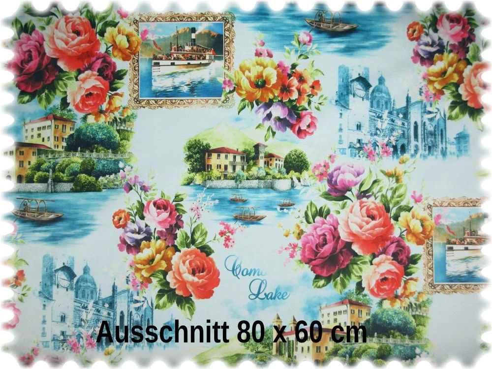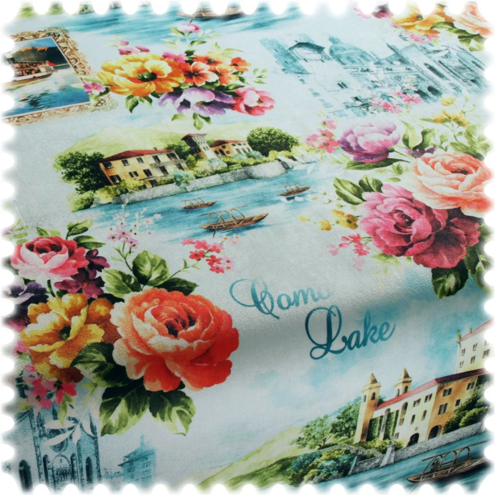 Exklusiv in einem aufwendigen Verfahren bedruckter Möbelstoff, in einem malerischen Design des Comer Sees und einer unverwechselbaren flauschigen Haptik. Dieser Samtstoff ist sehr strapazierfähig und weißt eine Scheuerbeständigkeit von 70.000 Touren auf. Zusätzlich ist er mit einem Fleckschutz ausgerüstet und dem entsprechend schmutz- und wasserabweisend. Der samtweiche exotische Stoff eignet sich mit diesem besonderen Motiv bestens für den Bezug von Polstermöbeln, Türpolsterungen, Vorhänge, Tagesdecken, Tischdecken, Wandbespannungen oder Kissenbezüge. Auch die Einarbeitung in Taschen oder andere Accessoires lässt jedes Objekt sommerlich strahlen und haucht ihm wahrlich Leben ein.