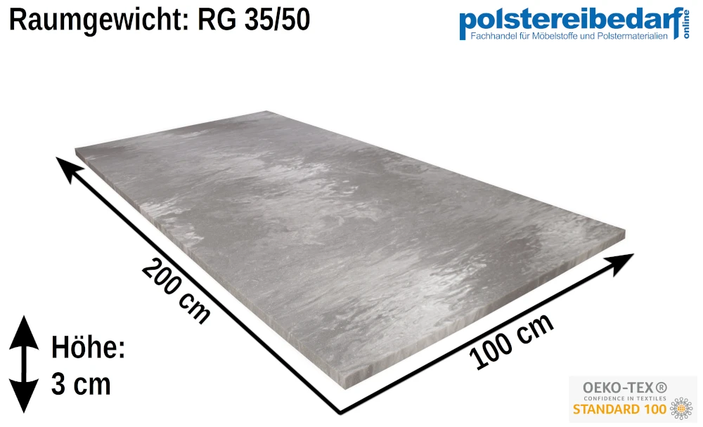 - DATEN: Graue Schaumstoff Platte – 3cm dick – 200x100cm – RG 35/50 – Stauchhärte 5,0kPa bei 40%