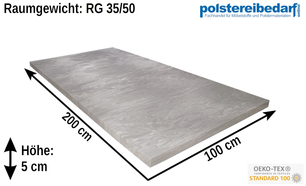 - DATEN: Graue Schaumstoff Platte – 5cm dick – 200x100cm – RG 35/50 – Stauchhärte 5,0kPa bei 40%
