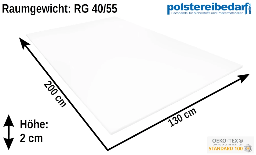 - DATEN: Weiße Schaumstoff Platte – 2cm dick – 200x130cm – RG 40/55 – Stauchhärte 55